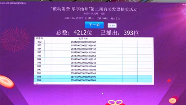 本期抽奖活动面向2025年11月1日至12月31日期间开具的消费发票。在池州市九华公证处的全程监督和公证下,现场依次抽取了特等奖、一等奖、二等奖、三等奖及四等奖共393张中奖发票总奖金30万元,其中特等奖3名,每名税前奖金3万元。