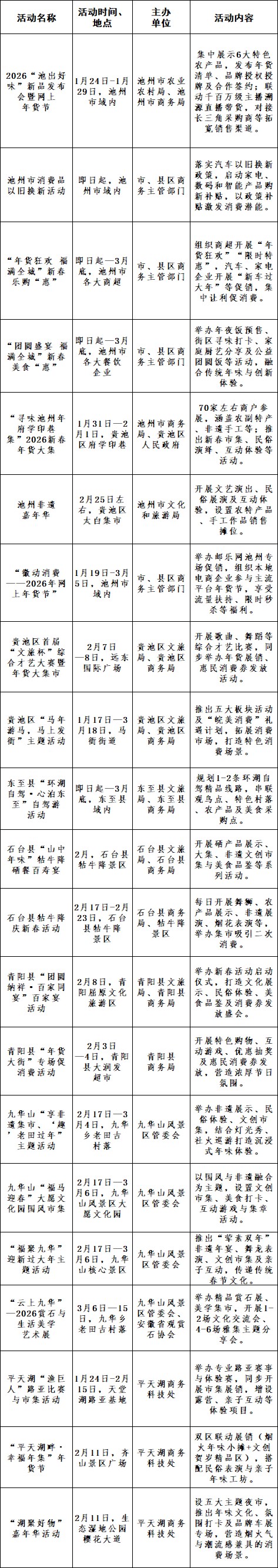 据悉,新春消费季期间,全市将举办各类促消费活动50余场,发放消费券1000万元。同时,将重点推出2026“池出好味”新品发布会暨网上年货节、“寻味池州年·府学印巷集”新春年货大集、池州非遗嘉年华等20多项特色活动。春节假期前后,一批丰富多彩的商文旅活动还将在全市商圈商街、景点景区及城乡各地陆续上演,进一步激活节日消费市场,持续释放新春消费潜力。